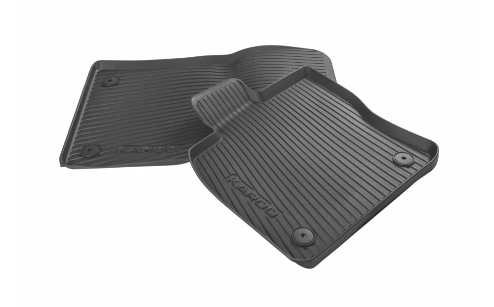 Celoroční koberce se zvýšeným okrajem jsou navrženy přesně na míru přední části podlahy ve voze Škoda Karoq. Optimálně vyplňují prostor pod nohama a díky prolisům, jimiž se nacvaknou na podlahové čepy, pevně drží na místě. Mají protiskluzový povrch, zachycují nečistoty a vlhkost z bot a velmi snadno se čistí. Lze je bez problému kdykoliv vyjmout a jednoduše omýt běžnými saponátovými prostředky.