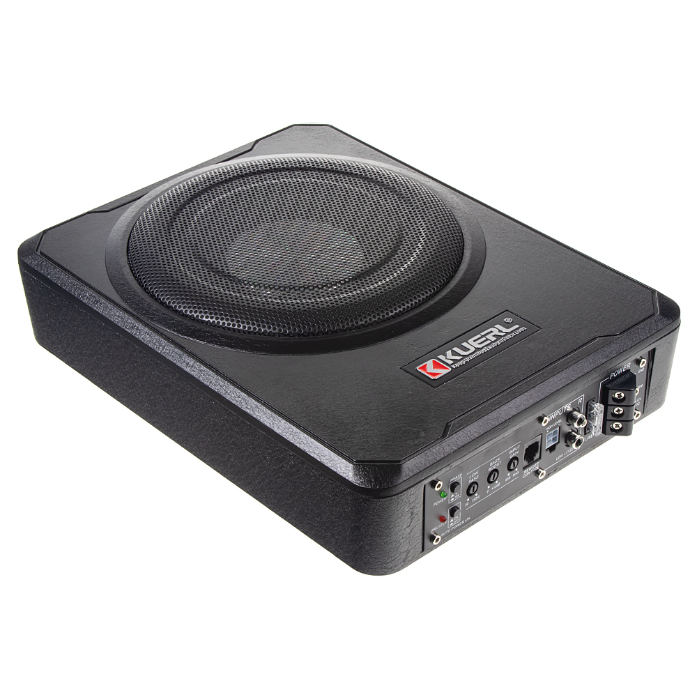 Aktivní subwooferový box se zesilovačem a reproduktorem o průměru 200 mm vhodný pro instalaci např. pod sedadlo.