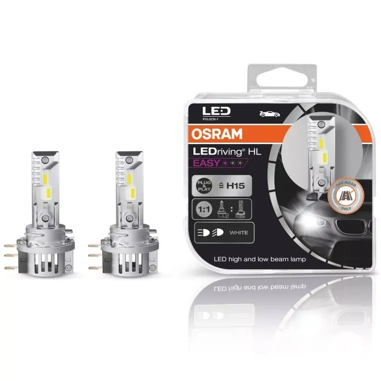 Díky řešení založenému na kompakních rozměrech poskytují světelné zdroje OSRAM LEDriving HL EASY ultrakompaktní náhradu běžných dálkových a potkávacích autožárovek H15 se studeným bílým světlem, stylovým vzhledem a vynikajícím jasem. Nabízí snadnou instalaci plug & play s optimalizovanou kompatibilitou. Nejsou potřeba žádné adaptéry a krytky! Optimalizovaný vysokorychlostní ventilátor zajišťuje aktivní chlazení. Díky maximalizovanému odvodu tepla je možný vyšší světelný výkon.