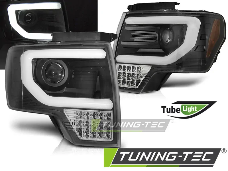 Přední světla Ford F-150 MK12 08-14 TUBE LIGHT - černá, bez homologace, snadná montáž výměnným způsobem, super cena, vysoce sportovní vzhled, cena za pár. Naše firma je přímým dovozcem!