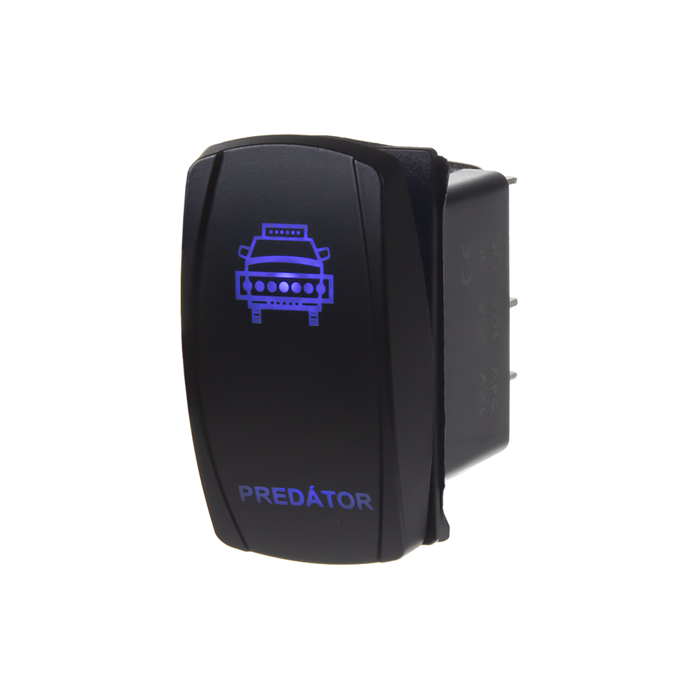 Spínač ROCKER2 kolébkový hranatý s modře podsvíceným symbolem predátoru a nápisem PREDÁTOR, pro napájecí napětí 12 V/20 A - 24 V/10 A, rozměr otvoru 37 x 21 mm, LED podsvícení.