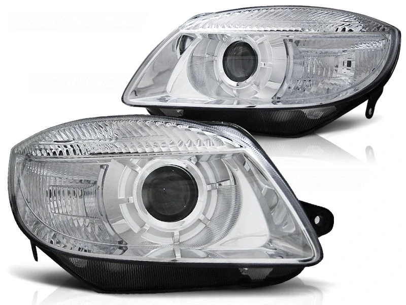 Přední čirá světla Škoda Fabia/Roomster 07-10 - chrom, homologace E - vyraženo na krytu světla, s pohonem pro el. naklápění / světla obsahují motor pro el. naklápění, potkávací světla H7 (není součástí dodávky), dálková světla H7 (není součástí dodávky).Snadná montáž výměnným způsobem, super cena, vysoce sportovní vzhled, cena za pár. Naše firma je přímým dovozcem!