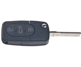Náhradní vystřelovací autoklíč s dálkovým ovladačem pro vozy Audi. Součástí klíče je planžeta, dálkové ovládání centrálního zamykání se třemi tlačítky a čip ID 48 pro imobilizér. Náhrada originálního ovladače 4D0 837 231 K.
