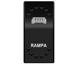 pínač ROCKER kolébkový hranatý s červeně podsvíceným symbolem rampy a nápisem RAMPA, pro napájecí napětí 12V/20A - 24V/10A, rozměr otvoru 37x21 mm, LED podsvícení.